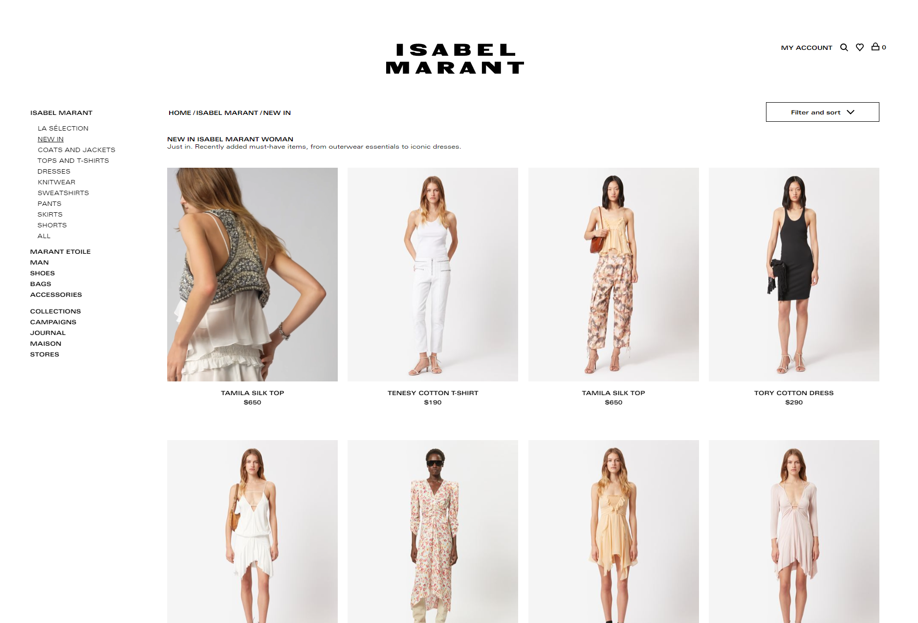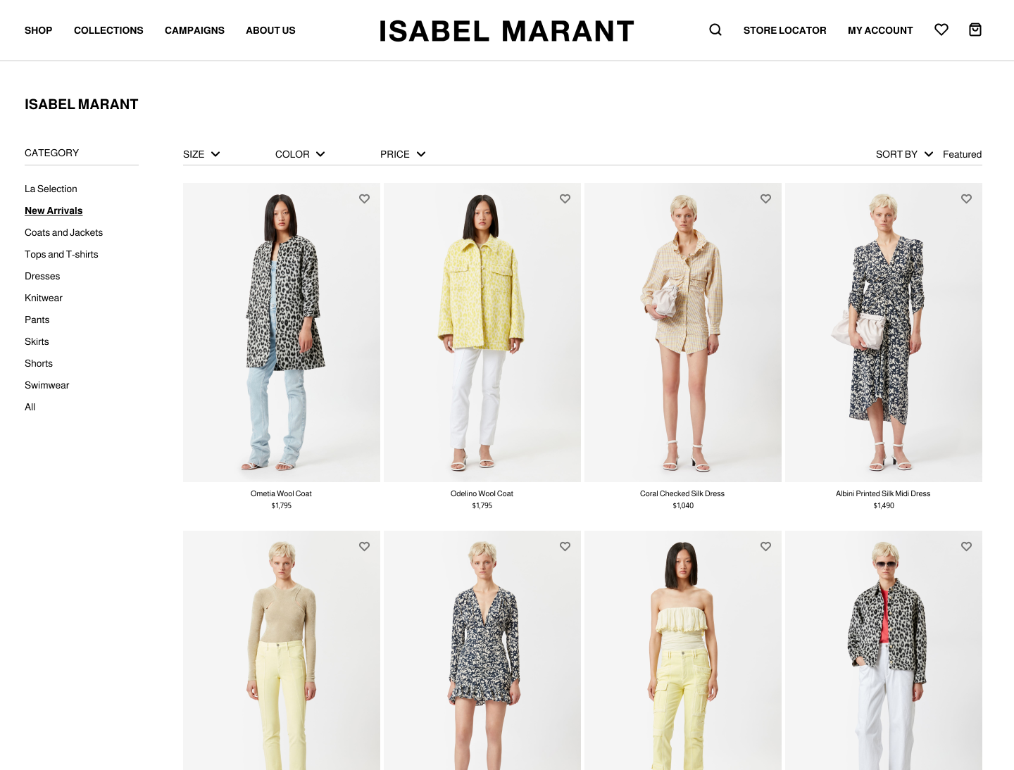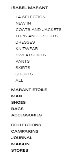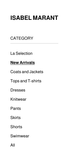 Since the top navigation already provides links to Isabel Marant’s main categories, under “Shop,” I added a left navigation to use as a quick-link menu to the respective subcategories.
