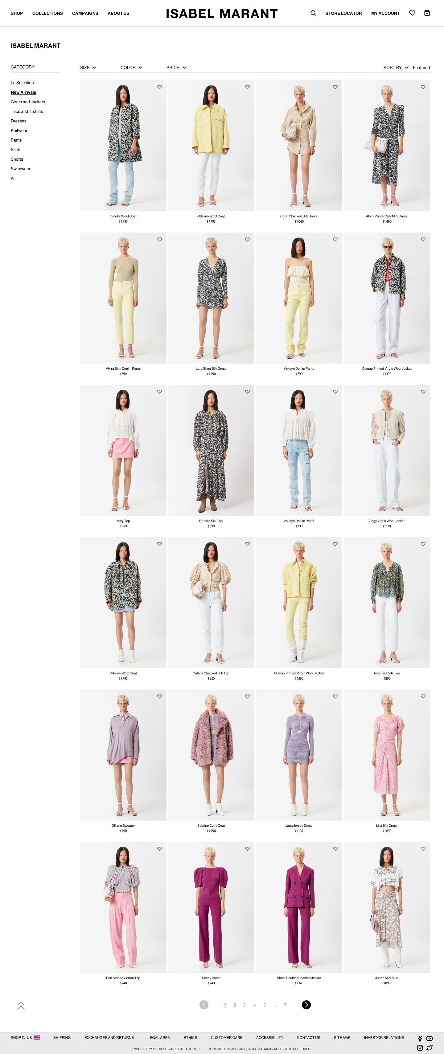 Isabel Marant has a “View More” button that lengthens the page and shows more products, which allows users to shop more products without changing pages; however, I think that extending ecommerce pages like this leads to endless scrolling, which feels never-ending, and ultimately leads to fatigue.